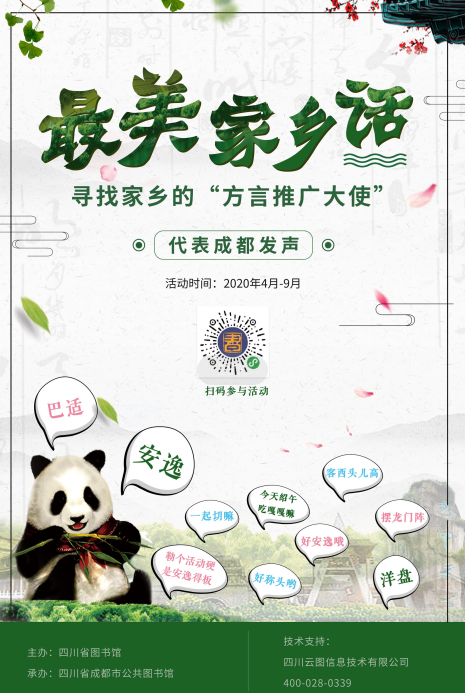 “最美家乡话”——寻找家乡的“声音大使”四川省图书馆网络+全民诵读活动,将方言传承与“全民阅读”推广相结合,赋予全民阅读新内容、新形式、新内涵,在全省范围内广泛推广,全民参与,感受方言魅力,丰富地方文化内涵。