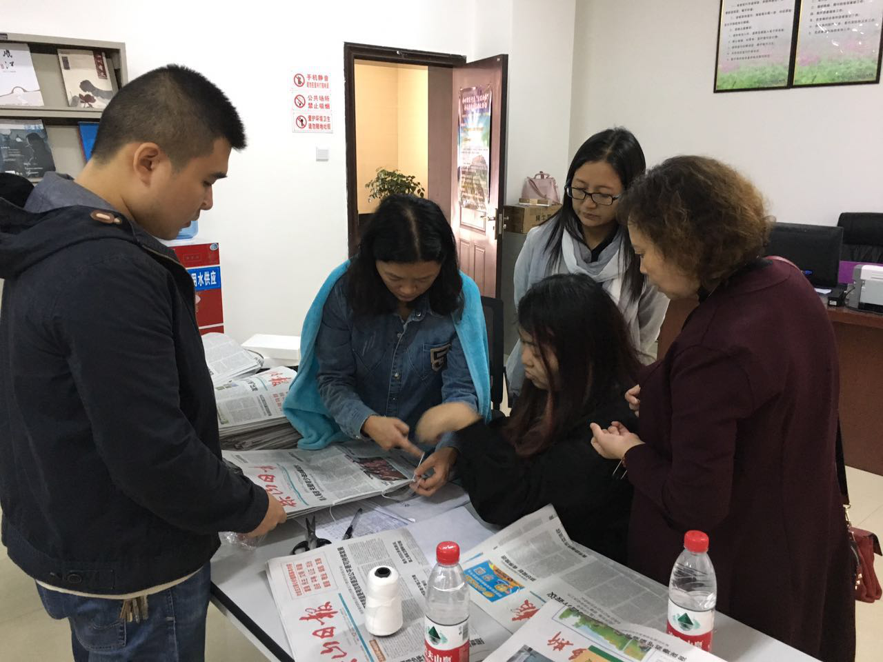 在金口河图书馆内,两馆工作人员就图书馆借阅制度,借阅卡的办理和使用规范等进行了交流。罗红萍还就报刊杂志的编码、装订、馆藏等进行了讲解,并对报纸的装订进行了现场指导。